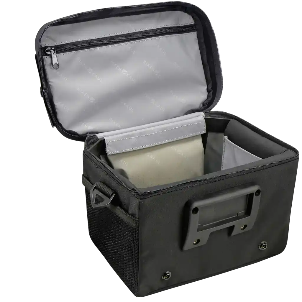 Mit Adapterplatte zum Anklicken an den Lenker Adapter auf der Taschenrückseite.